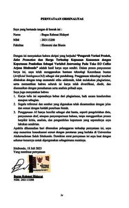 ABSTRAK Bagus Rahmat Hidayat. NIM. 202113208. “Pengaruh Variasi Produk, Sales Promotion dan Harga Terhadap Kepuasan Konsumen dengan Keputusan Pembelian Sebagai Variabel Intervening Pada Toko EO Coffee Arjasa Situbondo. Tujuan penelitian yaitu untuk mengetahui Pengaruh Variasi Produk, Sales Promotion dan Harga Terhadap Kepuasan Konsumen dengan Keputusan Pembelian Sebagai Variabel Intervening Pada Toko EO Coffee Arjasa Situbondo. Teknik sampling yang digunakan dalam penelitian ini adalah simple random sampling sebanyak 97 konsumen. Analisis data dan pengujian hipotesis dalam penelitian ini menggunakan Model Persamaan Struktural – Partial Least Square (PLS-SEM). Hasil uji menunjukkan bahwa Variasi produk berpengaruh positif dan signifikan terhadap Keputusan pembelian, Sales promotion berpengaruh signifikan terhadap Keputusan pembelian, Harga berpengaruh positif namun tidak signifikan terhadap Keputusan pembelian, Variasi produk berpengaruh negatif namun signifikan terhadap Kepuasan konsumen, Sales promotion berpengaruh positif dan signifikan terhadap Kepuasan konsumen, Harga berpengaruh positif namun tidak signifikan terhadap Keputusan pembelian, Keputusan pembelian berpengaruh positif dan signifikan terhadap Kepuasan konsumen, Variasi produk berpengaruh positif dan signifikan terhadap Kepuasan konsumen melalui Keputusan pembelian, Sales promotion berpengaruh positif dan signifikan terhadap Kepuasan konsumen melalui Keputusan pembelian, Harga berpengaruh positif namun signifikan terhadap Kepuasan konsumen melalui Keputusan pembelian. Kata kunci: Variasi Produk, Sales Promotion, Harga, Kepuasan Konsumen, Keputusan Pembelian
