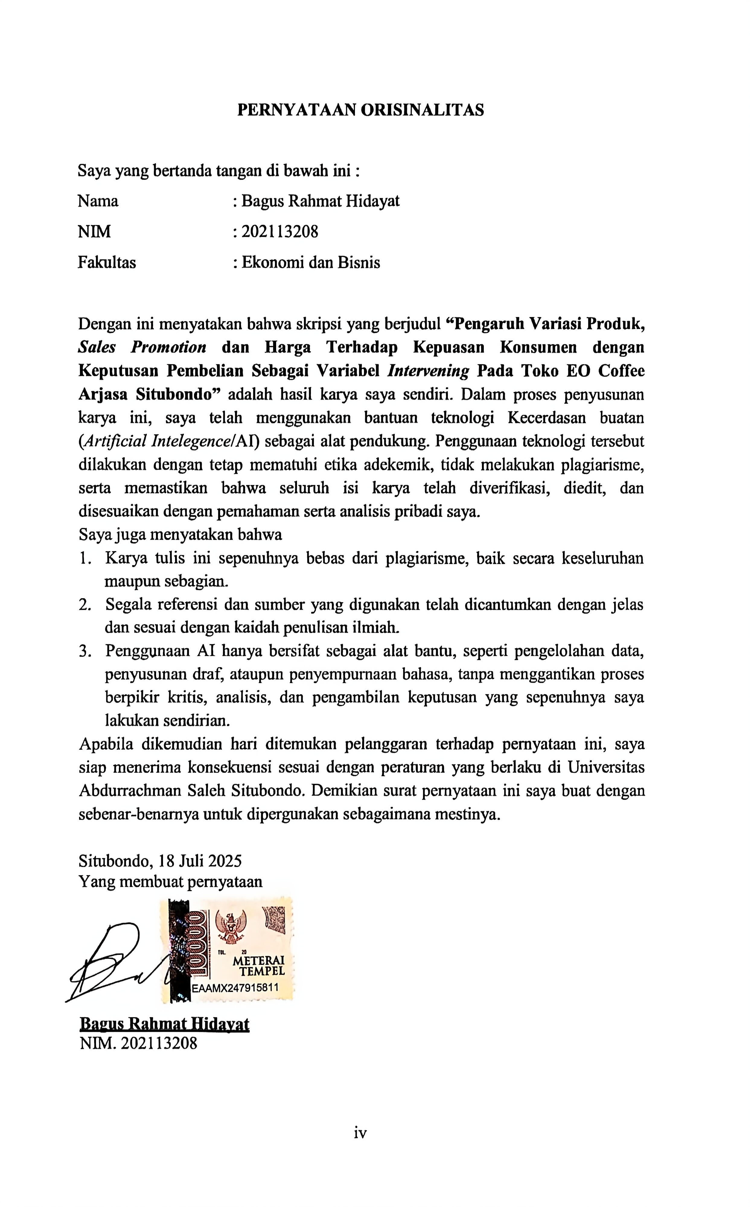 Bagus, Rahmat Hidayat (2025) PENGARUH VARIASI PRODUK, SALES PROMOTION, DAN HARGA TERHADAP KEPUASAN KONSUMEN DENGAN KEPUTUSAN PEMBELIAN SEBAGAI VARIABEL INTERVENING PADA TOKO EO COFFE ARJASA SITUBONDO. Other thesis, UNIVERSITAS ABDURACHMAN SALEH SITUBONDO.