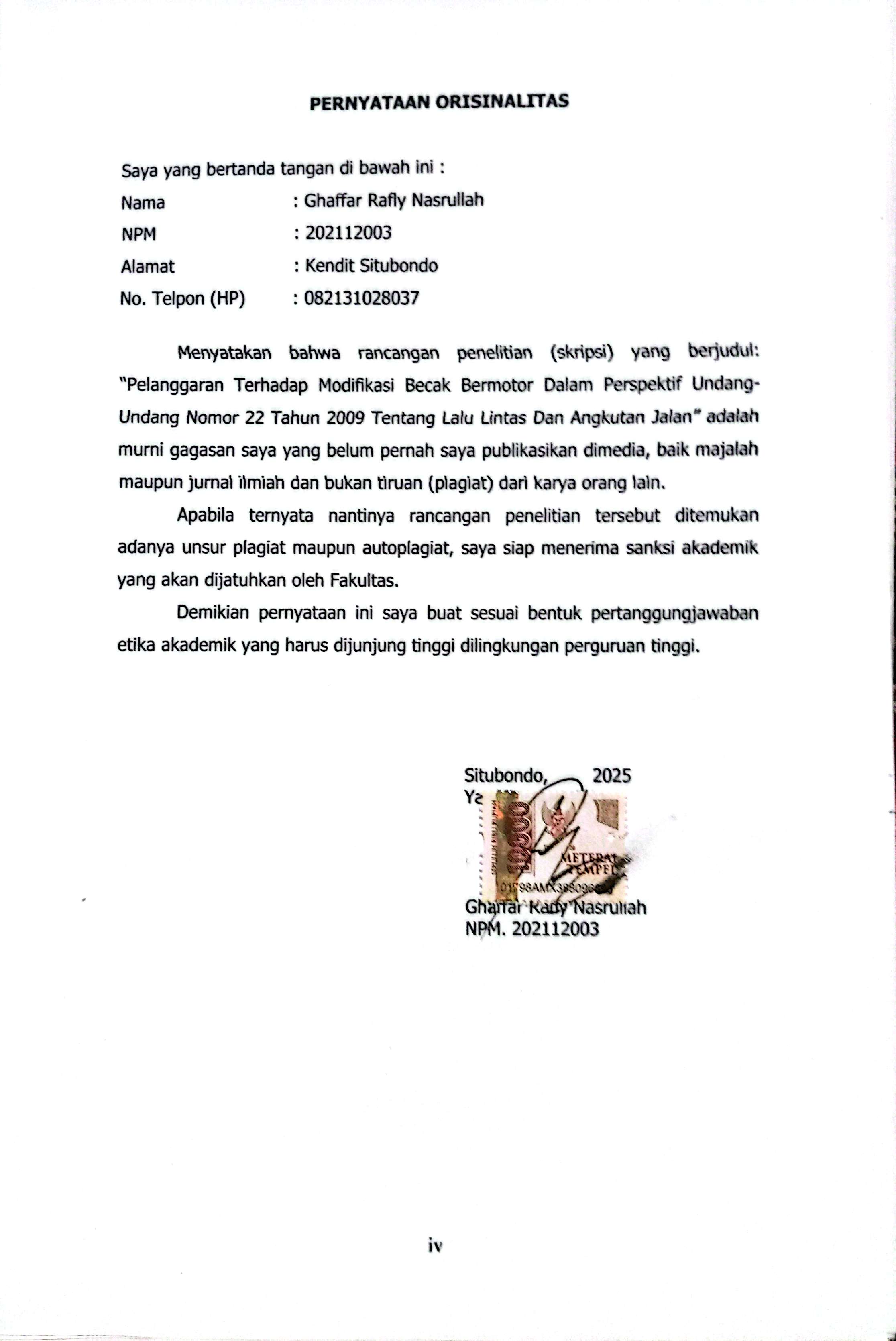 Ghaffar Rafly, Nasrullah and Irwan, Yulianto, S.H., M.H and Yudistira, Nugroho (2025) PELANGGARAN TERHADAP MODIFIKASI BECAK BERMOTOR DALAM PERSPEKTIF UNDANG-UNDANG NOMOR 22 TAHUN 2009 TENTANG LALU LINTAS DAN ANGKUTAN JALAN. Other thesis, Universitas Abdurachman saleh.