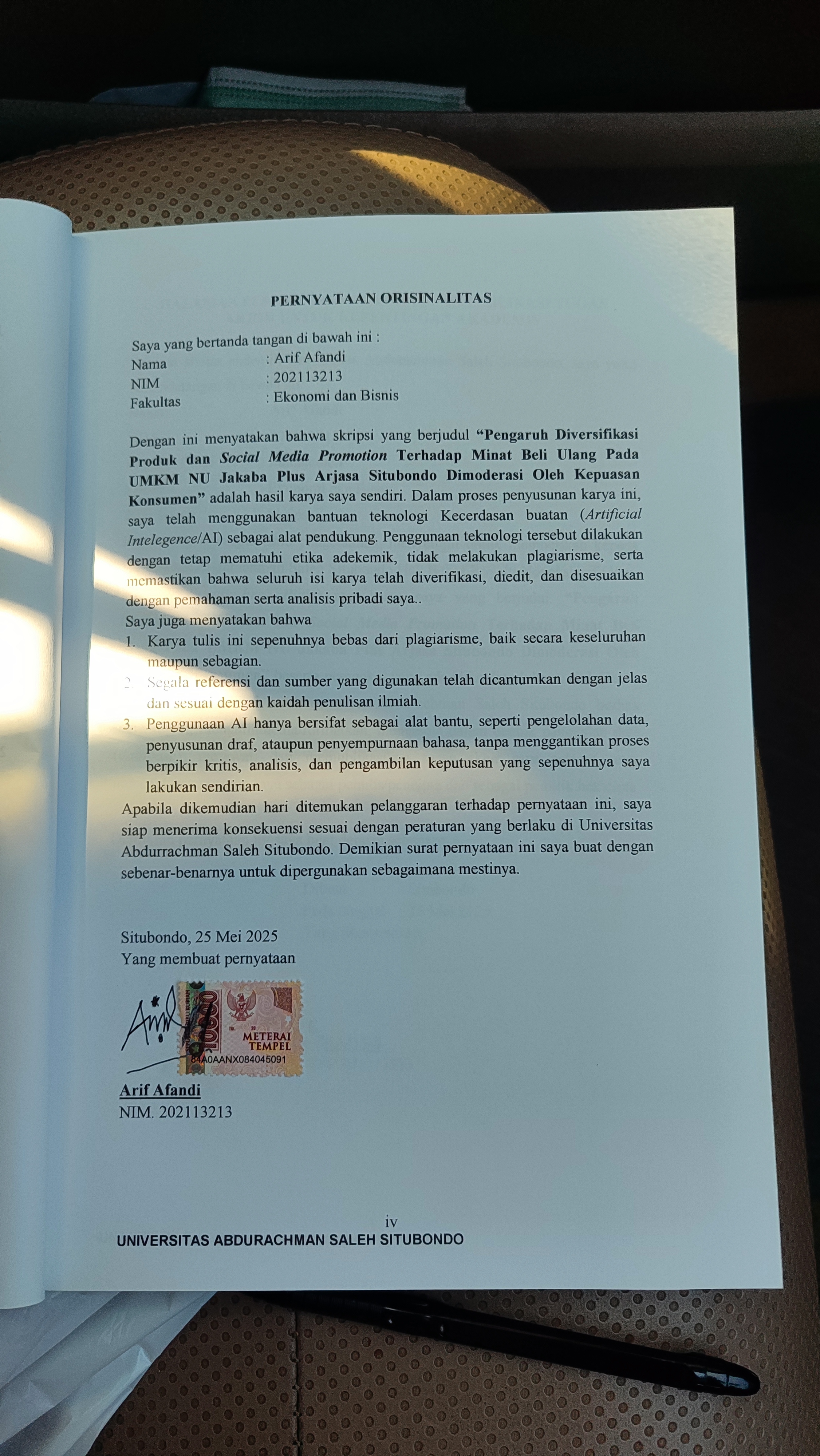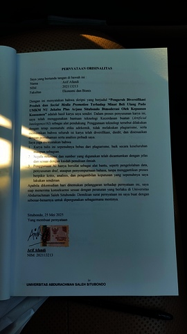 arif, afandi (2025) PENGARUH DIVERSIFIKASI PRODUK DAN SOCIAL MEDIA PROMOTION TERHADAP MINAT BELI ULANG PADA UMKM NU JAKABA PLUS ARJASA SITUBONDO DIMODERASI OLEH KEPUASAN KONSUMEN. Other thesis, universitas abdurachman saleh situbondo.