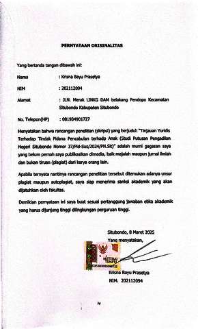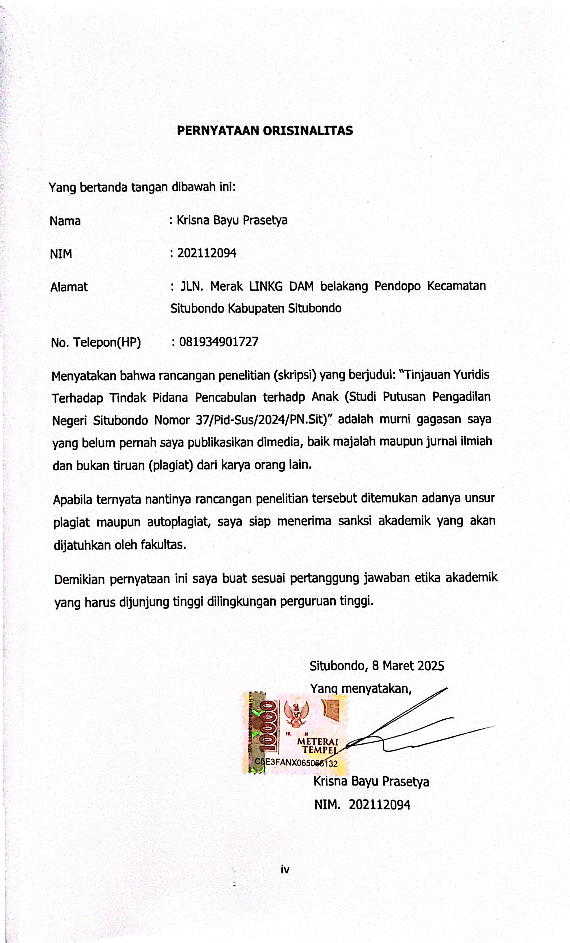 Krisna bayu, Prasetya (2025) TINJAUAN YURIDIS TINDAK PIDANA PENCABULAN TERHADAP ANAK DI KABUPATEN SITUBONDO (STUDI PUTUSAN PENGADILAN NEGERI SITUBONDO NOMOR 37/Pid.Sus./2024/PN.Sit). Other thesis, Universitas Abdurachman Saleh Situbondo.