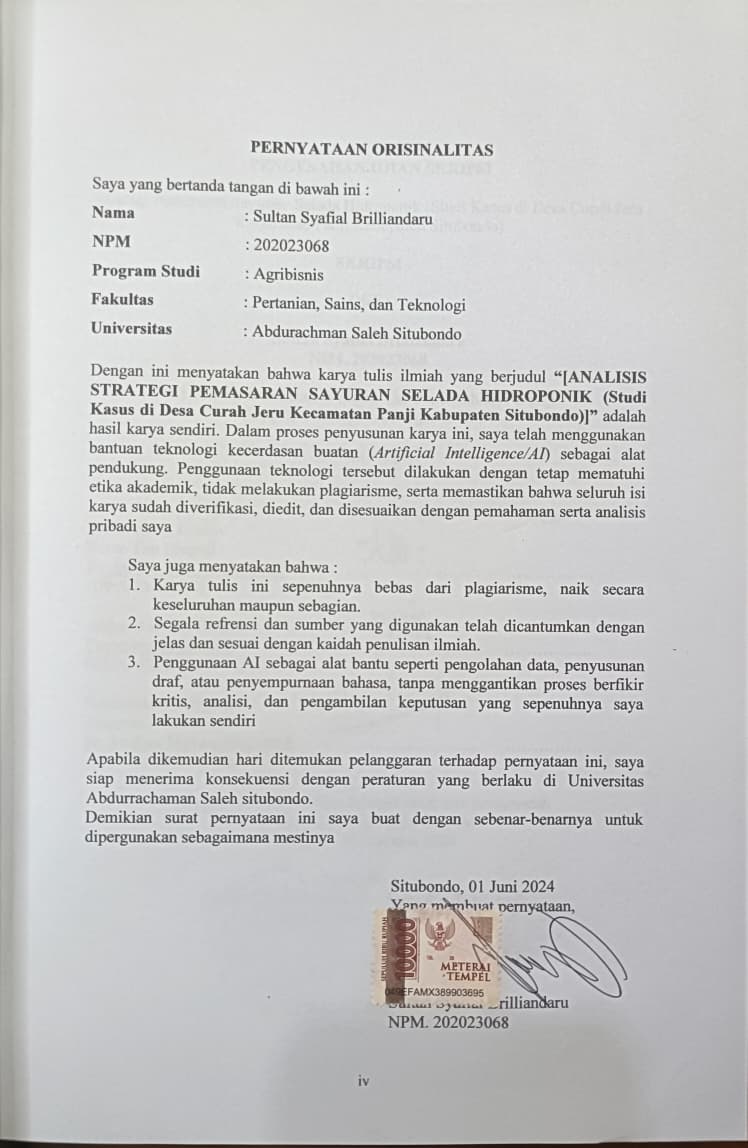 SULTAN, SYAFIAL.B (2025) ANALISIS STRATEGI PEMASARAN SAYURAN SELADA HIDROPONIK (Studi Kasus di Desa Curah Jeru Kecamatan Panji Kabupaten Situbondo). Other thesis, UNIVERSITAS ABDURACHMAN SALEH SITUBONDO.