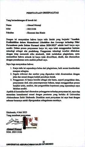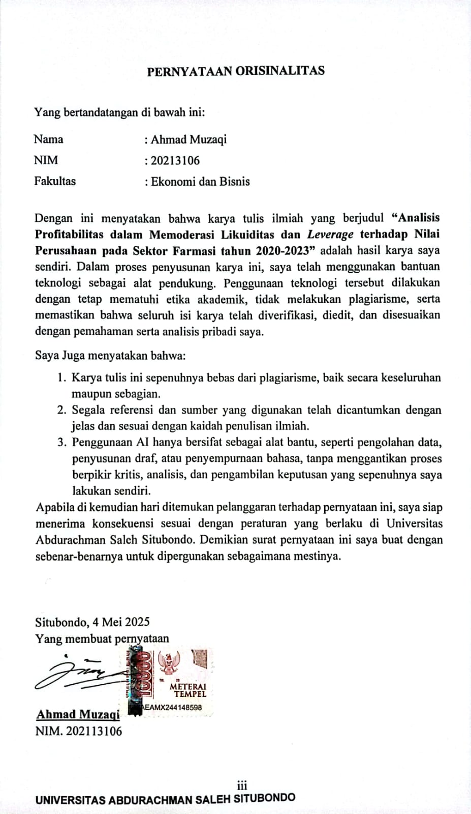 Ahmad, Muzaqi (2025) ANALISIS PROFITABILITAS DALAM MEMODERASI LIKUIDITAS DAN LEVERAGE TERHADAP NILAI PERUSAHAAN PADA SEKTOR FARMASI TAHUN 2020-2023. Other thesis, Universitas Abdurrachman Saleh Situbondo.