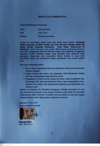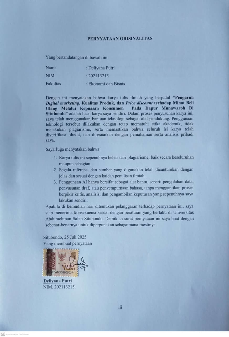 Deliyana, Putri and Riska, Ayu Pramesthi and Ediyanto, Ediyanto (2025) PENGARUH DIGITAL MARKETING, KUALITAS PRODUK, DAN PRICE DISCOUNT TERHADAP MINAT BELI ULANG MELALUI KEPUASAN KONSUMEN PADA DAPUR MUNAWAROH DI SITUBONDO. Other thesis, Univeristas Abdurachman Saleh Situbondo.