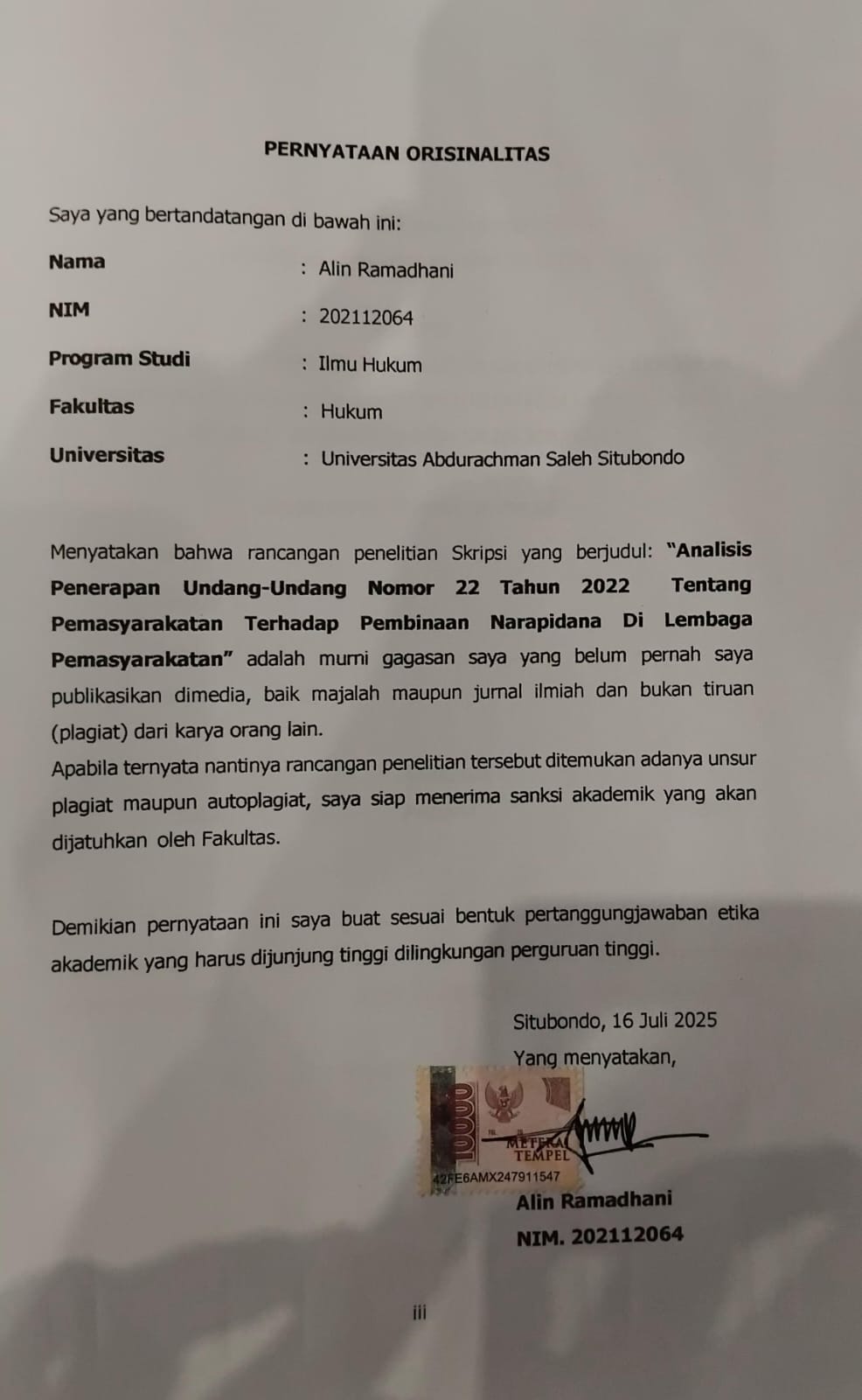 IDE PRIMA HADIYANTO, S.H., M.H., IDE and Irwan Yulianto, S. H., M. H., Irwan and ABDURRAHMAN MUQSITH, S.H., M.H., MUQSITH (2025) ANALISIS PENERAPAN UNDANG-UNDANG NOMOR 22 TAHUN 2025TENTANG PERMASYARAKATAN TERHADAP PEMBINAAN NARAPIDANA DI LEMBAGA PERMASYARAKATAN. Diploma thesis, UNIVERSITAS ABDURACHMAN SALEH SITUBONDO.