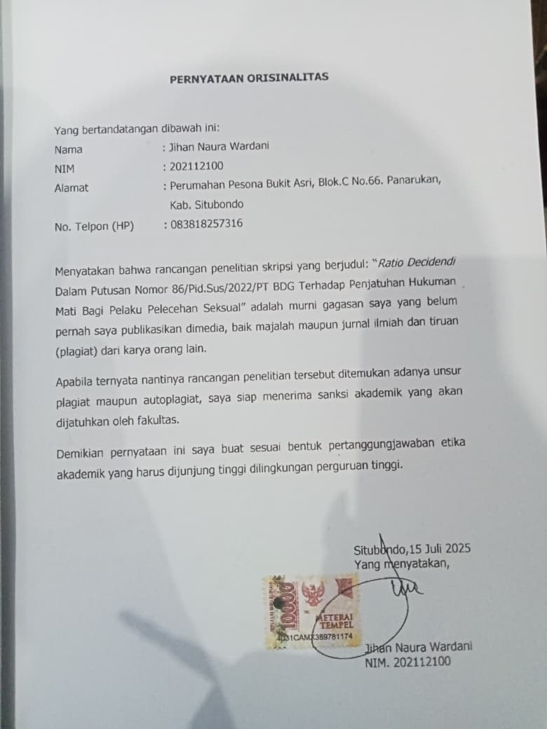 ABSTRAK Jihan Naura Wardani, NIM. 202112100,Ratio Decidendi dalam Putusan Nomor 86/Pid.Sus/2022/PT BDG Terhadap Penjatuhan Hukuman Mati bagi Pelaku Pelecehan Seksual. Penelitian yang berjudul Ratio Decidendi dalam Putusan Nomor 86/Pid.Sus/2022/PT BDG Terhadap Penjatuhan Hukuman Mati bagi Pelaku Pelecehan Seksual. Dilatar belakangi oleh meningkatnya kasus pelecehan seksual yang terjadi di Indonesia yang menimbulkan dampak serius, baik secara fisik maupun psikologis bagi para korban, serta menjadi tantangan dalam penegakan hukum di Indonesia. Penelitian ini bertujuan pertama, untuk mengetahui dan memahami tentang mengkaji bagaimana pertimbangan hukum (Ratio Decidendi) hakim dalam penjatuhan hukuman mati terhadap pelaku pelecehan seksual dalam Putusan Nomor 86/Pid.Sus/2022/PT BDG kedua, untuk mengetahui apakah pertimbangan hukum (Ratio Decidendi) tersebut telah sesuai dengan telah sesuai dengan prinsip keadilan, kepastian hukum, dan perlindungan Hak Asasi Manusia dalam hukum pidana di Indonesia. Metode penelitian yang digunakan dalam skripsi ini menggunakan metode penelitian yuridis normatif dengan pendekatan perundang-undangan, konseptual, dan kasus. Data dikumpulkan melalui studi kepustakaan dan dianalisis secara kualitatif. Berdasarkan hasil penelitian dapat disimpulkan Pertama, pertimbangan hukum (Ratio Decidendi) hakim didasarkan pada besarnya dampak fisik dan psikologis yang ditimbulkan kepada korban serta tindakan berulang yang dilakukan oleh pelaku, sehingga dipandang layak untuk dijatuhi hukuman mati. Kedua, Ratio Decidendi tersebut dinilai telah sesuai dengan prinsip keadilan, kepastian hukum, dan perlindungan Hak Asasi Manusia, karena mempertimbangkan kepentingan korban, dan masyarakat. Putusan ini mencerminkan keseriusan peradilan dalam memberikan keadilan dan perlindungan hukum yang maksimal. Kata Kunci: Pertimbangan Hukum, Hukuman Mati, Pelaku Seksual.