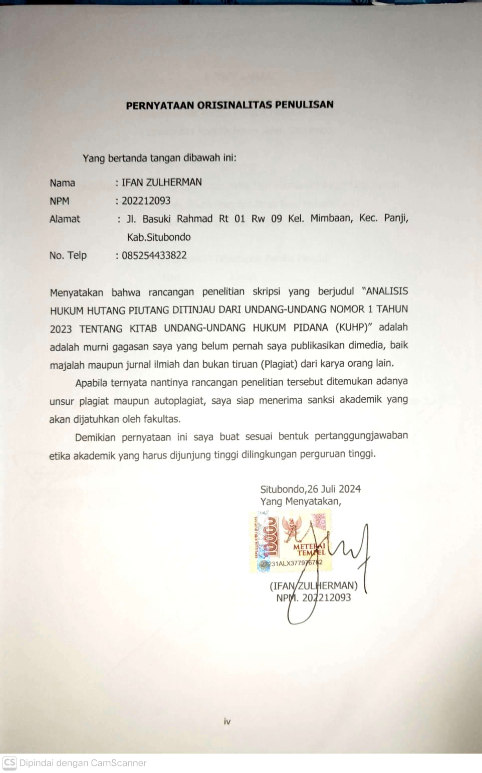 ABSTRAK Ifan Zulherman, NPM. 202212093, Analisis Hukum Hutang Piutang Ditinjau Dari Undang-Undang Nomor 1 Tahun 2023 Tentang Kitab Undang-Undang Hukum Pidana (KUHP) Pasal 497 pada UU 1/2023 Setiap Orang yang menjadikan sebagai mata pencaharian atau kebiasaan membeli Barang dengan maksud untuk menguasai Barang tersebut bagi diri sendiri atau orang lain tanpa melunasi pembayaran, dipidana dengan pidana penjara paling lama 5 (lima) tahun atau pidana denda paling banyak kategori V yaitu Rp500 juta. Penelitian ini bertujuan pertama untuk menganalisis analisis hukum hutang piutang ditinjau dari Undang-Undang Nomor 1 Tahun 2023 Tentang Kitab Undang-Undang Hukum Pidana (KUHP). Tujuan kedua untuk menganalisis tanggung jawab pidana pelaku penagih utang. Metode penelitian yang digunakan dalam skripsi ini menggunakan metode penelitian yuridis normatif yang merupakan penelitian kepustakaan, yaitu penelitian yang terhadap peraturan perundangan-undangan dan literatur yang berkaitan dengan materi yang dibahas. Berdasarkan uraian latar belakang dan pembahasan penelitian ini, maka dapat diambil kesimpulan bahwa Analisis hukum hutang piutang ditinjau dari Undang-Undang Nomor 1 Tahun 2023 Tentang Kitab Undang-Undang Hukum Pidana (KUHP) bahwa sengketa utang piutang yang tidak dapat diselesaikan secara musyawarah justru malah dilaporkan ke pihak kepolisian dengan dasar Pasal 372 KUHP tentang Penggelapan dan Pasal 378 KUHP tentang Penipuan. Padahal substansi dari tindak pidana penggelapan dan tindak pidana penipuan adalah jelas berbeda dari suatu perjanjian yang merupakan perbuatan hukum perdata. Untuk dapat diproses secara pidana, harus ada perbuatan (actus reus) dan niat jahat (mens rea) dalam terpenuhinya unsur-unsur pasal pidana tersebut. Tanggung jawab pidana pelaku penagih utang bahwa ada dua pasal yang akan menjerat bagi pelaku penagih utang yaitu Pasal 378 KUHP pada Bab XXV tentang Perbuatan Curang (bedrog) dan Pasal 27A dan 27B soal pencemaran nama baik, Pasal 29 soal ancaman pribadi terdapat UU Nomor 1 Tahun 2024. Kata Kunci: Analisis Hukum, Hutang Piutang, Undang-Undang Nomor 1 Tahun 2023 tentang Kitab Undang-Undang Hukum Pidana (KUHP)