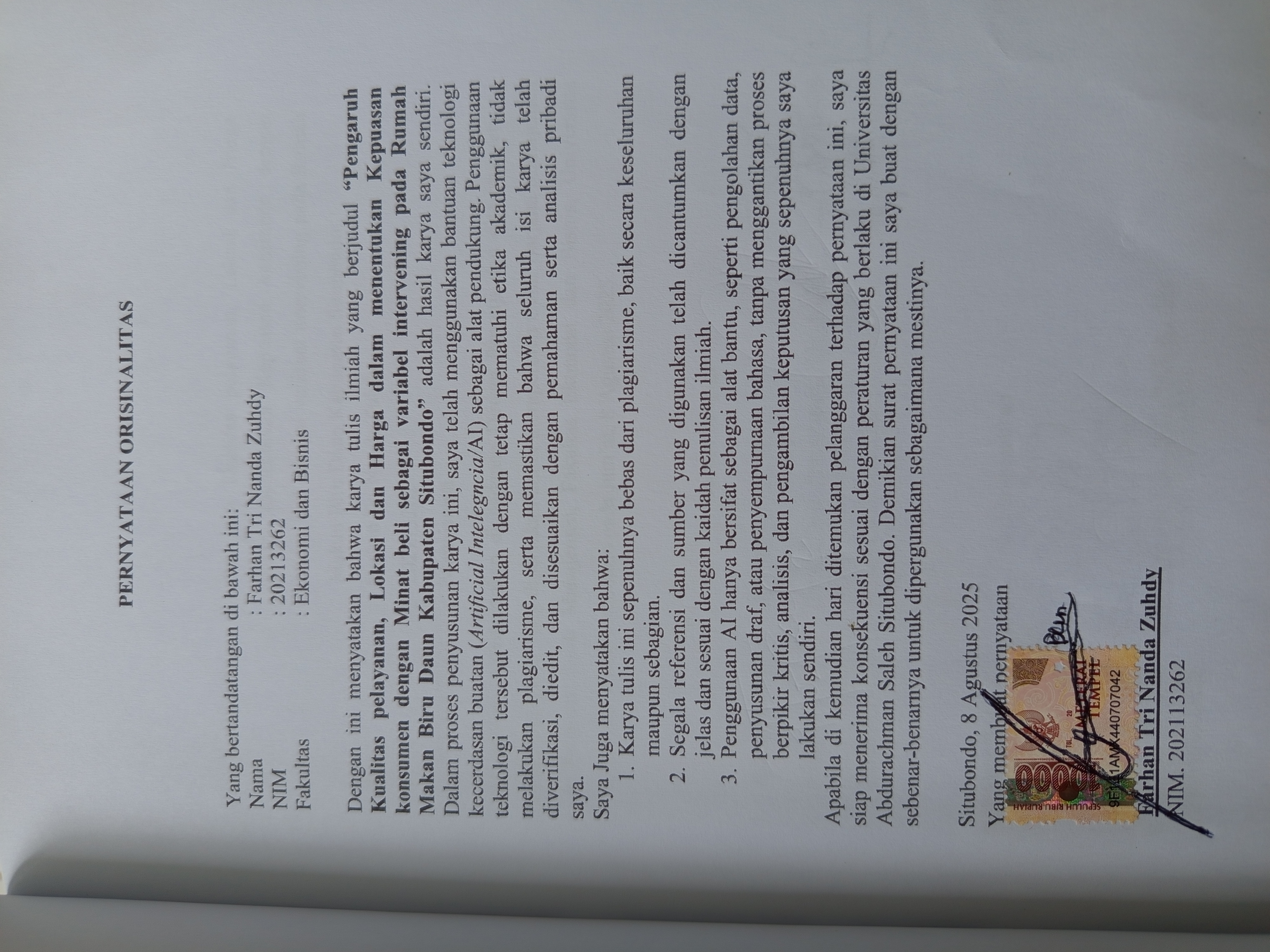 Zuhdy, Farhan Pengaruh kualitas pelayanan, lokasi dan harga dalam menentukan kepuasan konsumen dengan minat beli sebagai variabel intervening pada rumah makan biru daun kabupaten situbondo. Pengaruh kualitas pelayanan lokasi dan harga dalam menentukan kepuasan konsumen dengan minat beli sebagai variabel intervening pada rumah makan biru daun kabupaten situbondo.