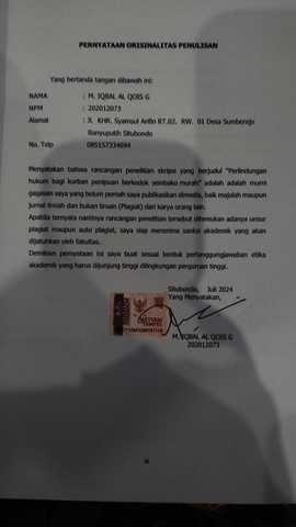 M. IQBAL, AL QOIS G (2024) PERLINDUNGAN HUKUM PENIPUAN BAGI KORBAN BERKEDOK SEMBAKO MURAH. Other thesis, UNIVERSITAS ABDURACHMAN SALEH SITUBONDO.