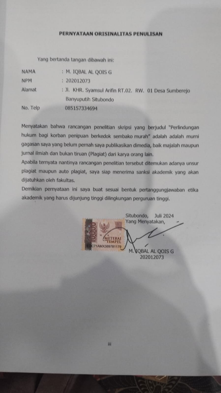 ABSTRAK M. IQBAL AL QOIS G, NPM. 202012073, Perlindungan Hukum Penipuan bagi Korban Berkedok Sembako Murah Penelitian ini berjudul Perlindungan Hukum Penipuan bagi Korban Berkedok Sembako Murah. Kedok sembako murah dengan menyebarkan informasi palsu tentang sembako murah sehingga konsumen mengalami kerugian. Menyebarkan informasi palsu di media sosial dan yang kasus yang lain telah menstransfer sejumlah uang untuk membeli sembako murah tersebut. Penelitian ini bertujuan pertama Untuk mengetahui perlindungan hukum penipuan bagi korban berkedok sembako murah. Tujuan kedua untuk mengetahui akibat hukum bagi pelaku penipuan berkedok sembako murah. Isu hukum tentang kekaburan hukum tentang Pasal 378 KUHP Nomor 1 tahun 1946 Metode penelitian yang digunakan dalam skripsi ini menggunakan tipe penelitian yuridis normatif yang merupakan penelitian kepustakaan, yaitu penelitian yang terhadap peraturan perundangan-undangan dan literatur yang berkaitan dengan materi yang dibahas. Pendekatan penelitian menggunakan pendekatan perundang-undangan (statute approach), pendekatan konseptual (conseptual approach) dan pendekatan kasus (case approach). Berdasarkan uraian latar belakang dan pembahasan penelitian ini, maka dapat diambil kesimpulan bahwa Perlindungan hukum penipuan bagi korban berkedok sembako murah bahwa Pasal 378 KUHP dengan hukuman penjara selama-lamanya empat tahun. Akibat hukum dengan adanya penipuan berkedok sembako murah bahwa Pasal 14 ayat (1) dari Undang-Undang Nomor 1 Tahun 1946 tentang Peraturan Hukum Pidana memberikan ketentuan bahwa, “Barang siapa, dengan menyiarkan berita atau pemberitahuan bohong, dengan sengaja menerbitkan keonaran dikalangan rakyat, dihukum dengan hukuman penjara setinggi-tingginya sepuluh tahun Kata Kunci: perlindungan hukum, penipuan, bagi korban berkedok sembako murah.