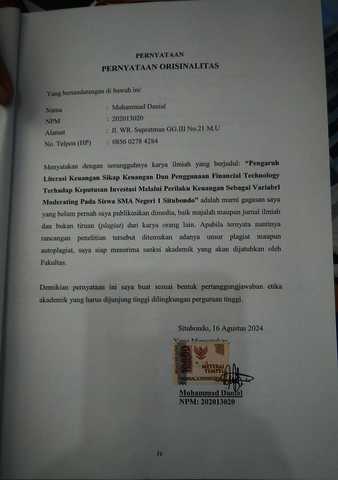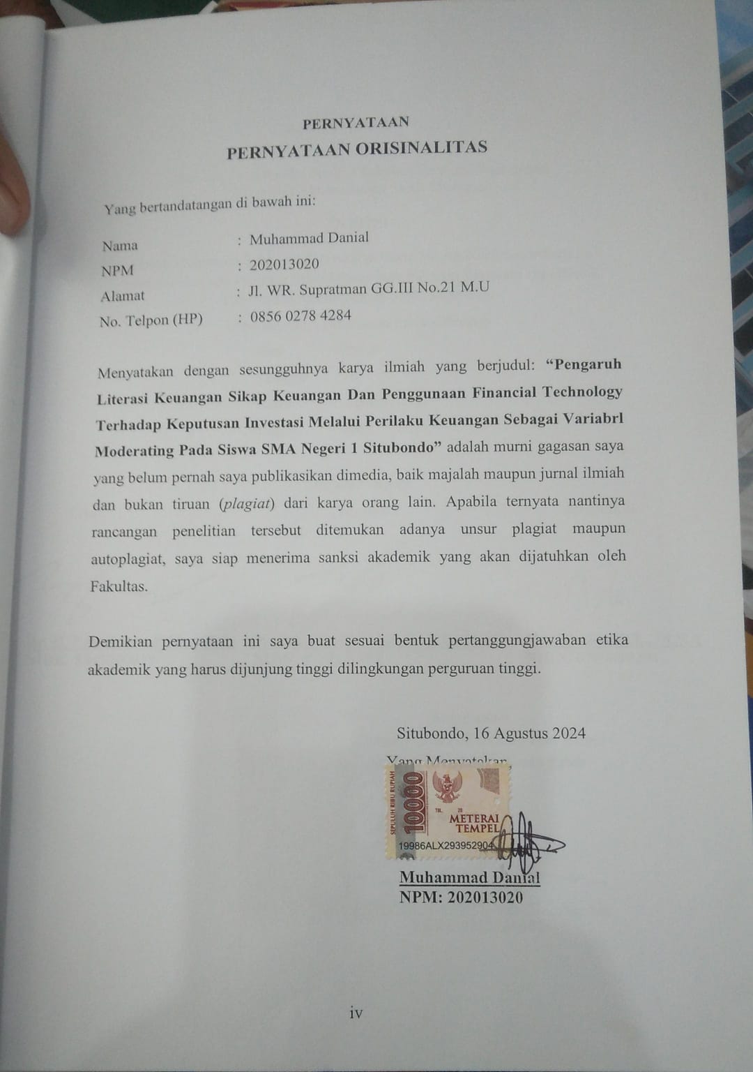 Muhammad, Danial (2025) PENGARUH LITERASI KEUANGAN, SIKAP KEUANGAN DAN PENGGUNAAN FINANCIAL TECHNOLOGY TERHADAP KEPUTUSAN INVESTASI MELALUI PERILAKU KEUANGAN SEBAGAI VARIABEL MODERATING PADA SISWA SMA NEGERI 1 SITUBONDO. Other thesis, UNIVERSITAS ABDURACHMAN SALEH SITUBONDO.