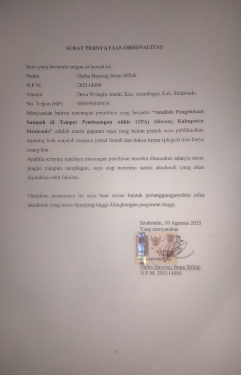 Hafna Bayroqi Bram Billah, HBBB and Giyanto, Giyanto and Hasan, Muchtar F. (2026) ANALISIS PENGELOLAAN SAMPAH DI TEMPAT PEMBUANGAN AKHIR (TPA) SLIWUNG KABUPATEN SITUBONDO. Other thesis, Universitas Abdurachman Saleh Situbondo.