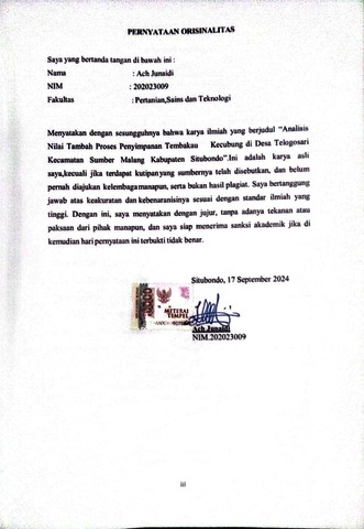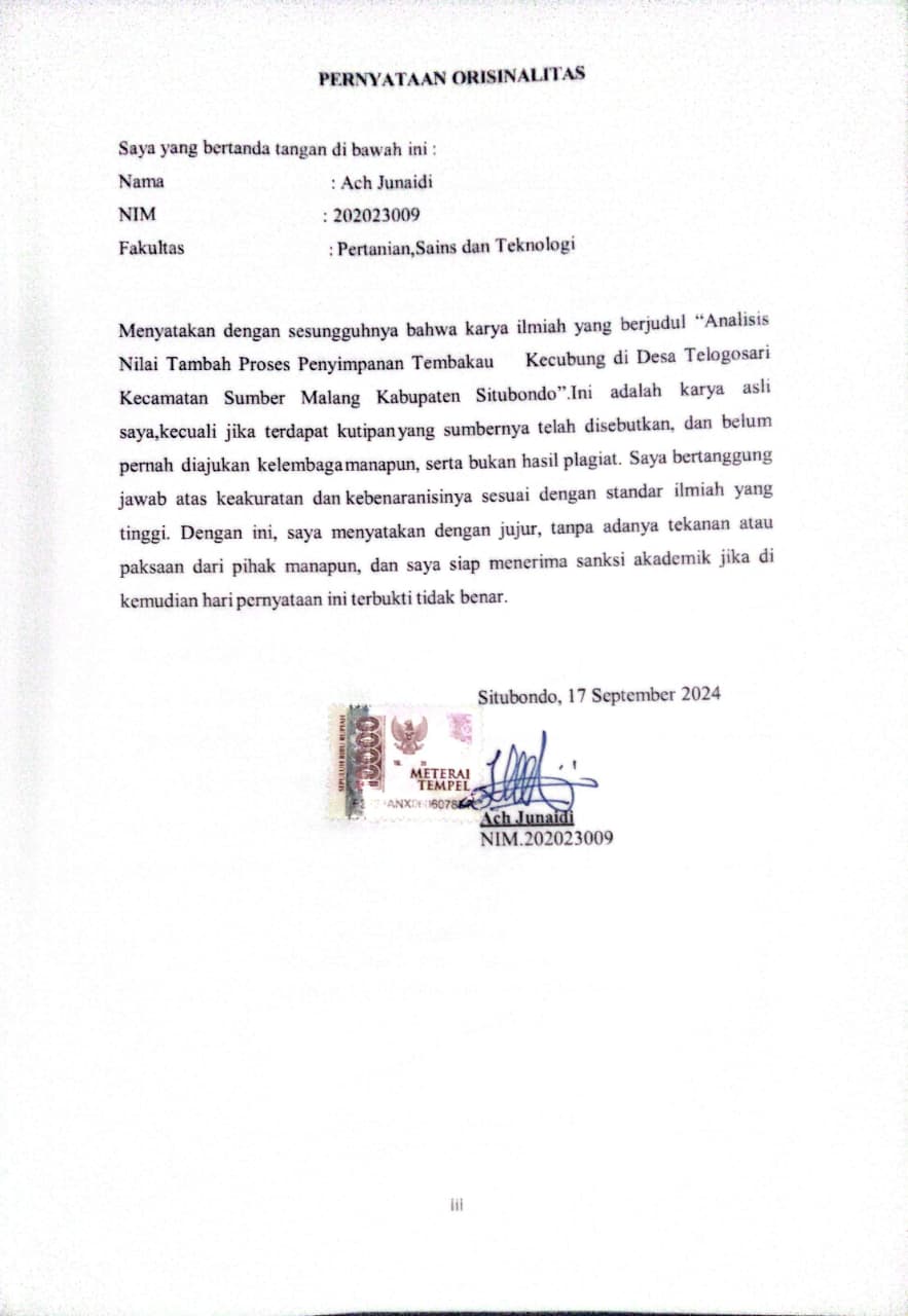 Ach Junaidi, AJ and Andina, Mayangsari and Yasmini, Suryaningsih (2024) ANALISIS NILAI TAMBAH PROSES PENYIMPANAN TEMBAKAU KECUBUNG DI DESA TELOGOSARI KECAMATAN SUMBER MALANG KABUPATEN SITUBONDO. Other thesis, Universitas Abdurachman Saleh Situbondo.