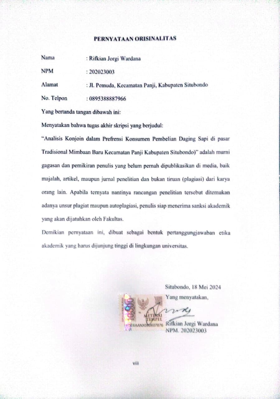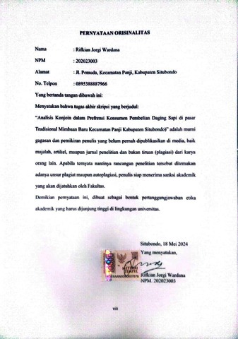 Rifkian Jorgi Wardana, RJW and Sulistyaningsih, S and Puryantoro, Puryantoro (2026) PREFERENSI KONSUMEN DALAM PEMBELIAN DAGING SAPI DI PASAR TRADISIONAL MIMBAAN BARU KECAMATAN PANJI KABUPATEN SITUBONDO. Other thesis, Universitas Abdurachman Saleh Situbondo.